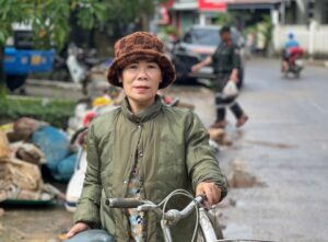 Bà Đặng Thị Thanh Tuyết (55 tuổi, trú thôn Mỹ Xuân 1, xã Hoà Thịnh) đi dọc đường tìm các đoàn từ thiện để xin thực phẩm, chăn màn. Trận lũ vừa rồi đã khiến xe máy, tủ lạnh, 20 bao thóc cùng đồ đạc trong nhà bị ngập hết. “Giờ tôi cần nhất gạo, ăn mì tôm mấy ngày liền rồi”, bà Tuyết nói và cho biết trước khi nước dâng cao cũng đã nhận được thông báo từ thôn.